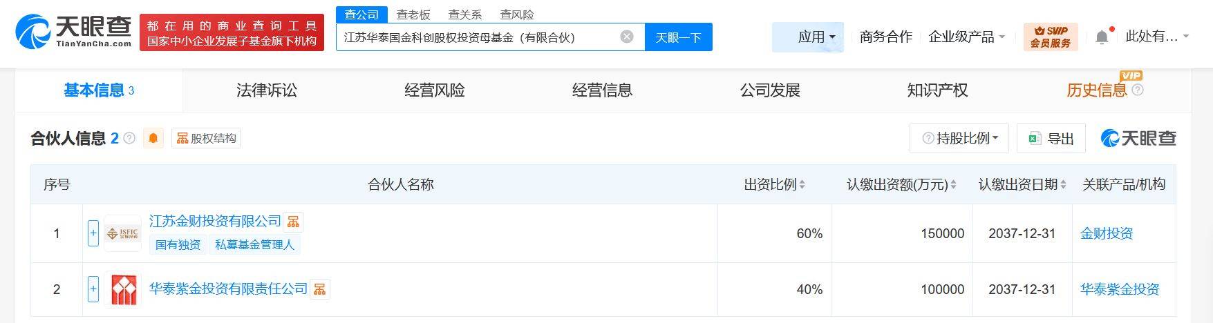 天眼查工商信息显示,近日,江苏华泰国金科创股权投资母基金(有限合伙)成立,执行事务合伙人为华泰紫金投资有限责任公司,出资额25亿人民币,经营范围为股权投资,以私募基金从事股权投资、投资管理、资产管理等活动,创业投资。合伙人信息显示,该基金由江苏金财投资有限公司、华泰证券(601688)旗下华泰紫金投资有限责任公司分别持股60%、40%。