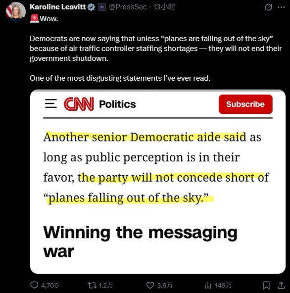 “哇!民主党现在竟然说,除非因空中交通管制员人员短缺导致‘飞机从天上掉下来’,否则他们不会结束政府关门状态,”白宫新闻发言人莱维特在社交媒体X平台发布了CNN报道截图,并写道,“这是我读过的最令人厌恶的言论之一。”