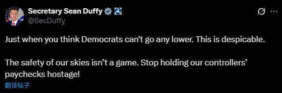 紧接着,美国交通部长肖恩·达菲转发了莱维特的推文。他同样讨伐道:“我原以为民主党不会更low了。这真是太卑鄙了。我们的航空安全不是儿戏。别再拿我们管制员的薪水当人质了!”