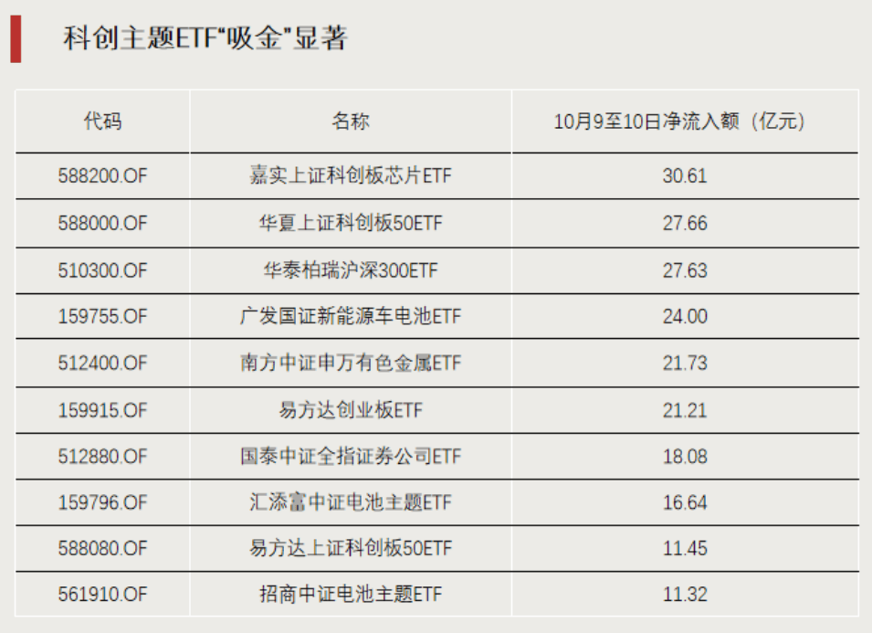Wind数据显示,10月9日至10月10日,嘉实上证科创板芯片ETF获资金净流入额超30亿元,华夏上证科创板50ETF、易方达上证科创板50ETF获资金净流入额分别为27.66亿元、11.45亿元。