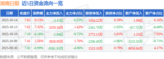 证券之星消息,截至2025年10月14日收盘,湖南白银(002716)报收于7.63元,上涨0.13%,换手率18.58%,成交量407.52万手,成交额32.27亿元。