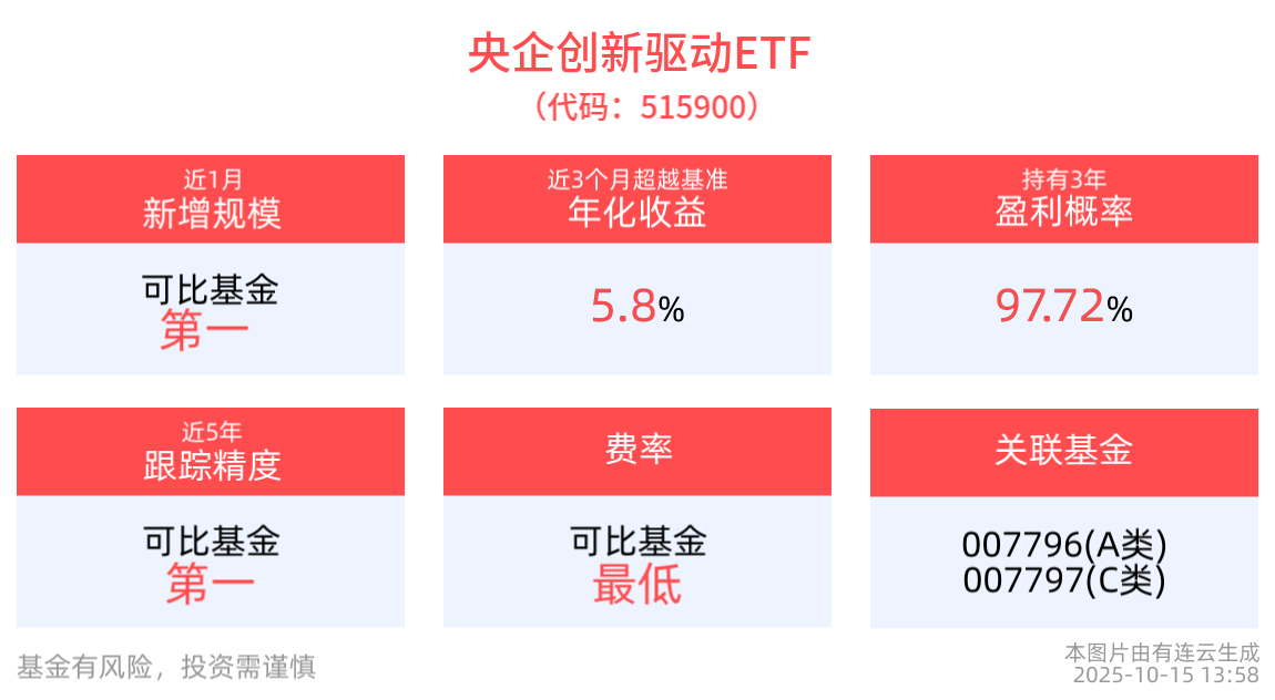 央企创新驱动ETF紧密跟踪中证央企创新驱动指数,中证央企创新驱动指数从国资委下属央企上市公司中,综合评估其在企业创新和盈利质量方面的综合情况,选取较具代表性的100只上市公司证券作为指数样本,以反映较具创新活力的央企上市公司证券的整体表现。