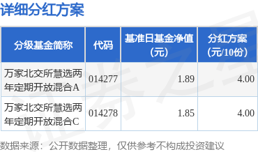 证券之星消息,10月16日发布《万家北交所慧选两年定期开放混合型证券投资基金分红公告》。2025年第1次分红。公告显示,本次分红的收益分配基准日为10月10日,详细分红方案如下: