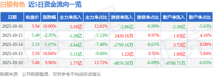 证券之星消息,截至2025年10月16日收盘,白银有色(601212)报收于5.94元,上涨10.0%,涨停,换手率9.45%,成交量699.56万手,成交额40.9亿元。