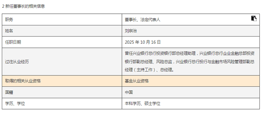 公告显示,10月16日,公司原董事长叶文煌因年龄原因离任,同日刘宗治出任公司新任董事长。业内人士分析认为,刘宗治在大资管领域深耕多年,有望进一步强化兴业基金作为银行系公募的核心优势,在遵循市场化运作规律的基础上,推动兴业基金做大“银行系特色”的公募品牌。