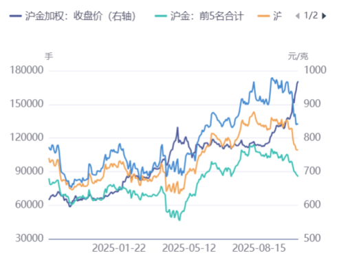 如黄金期货持仓量前5名席位的净多单持仓量,从4月底的5.44万手,增加至8月底的10.28万手;黄金期货持仓量前10名席位的净多单持仓量,从4月底的7.43万手,增加至8月底的12.76万手;黄金期货持仓量前20名席位的净多单持仓量,从4月底的8.87万手,增加至8月底的15.33万手。