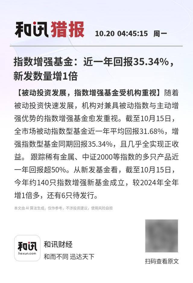 【被动投资发展,指数增强基金受机构重视】随着被动投资快速发展,机构对兼具被动指数与主动增强优势的指数增强基金愈发重视。截至10月15日,全市场被动指数型基金近一年平均回报31.68%,增强指数型基金同期回报35.34%,且几乎全实现正收益。 跟踪稀有金属、中证2000等指数的多只产品近一年回报超50%。从新发基金看,截至10月15日,今年约140只指数增强新基金成立,较2024年全年增1倍多,还有6只待发行。