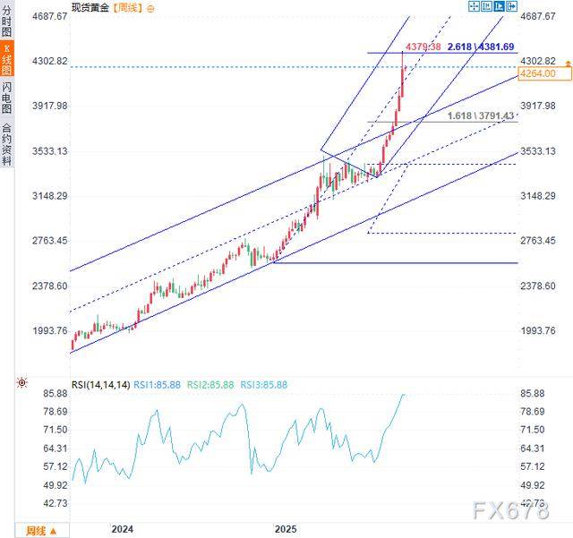 总的来说,本周金价突破历史高点,在动能、波动幅度与持续周期三大维度均创下多年极值——技术性衰竭风险正在加剧。若本轮涨势欲延续上行,需确保4000关口支撑不被突破,同时必须实现周线收于4308阻力上方,方能引爆下一轮主升浪。