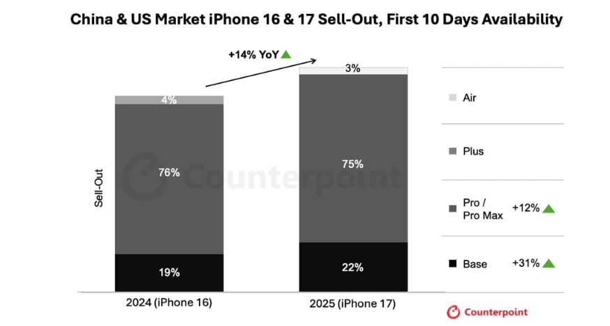 四,消费电子方面,iPhone17销量超预期。根据Counterpoint Research每周智能手机追踪器,iPhone 17系列在中国和美国上市的前10天内销量比iPhone 16系列高出14%,这两个市场是苹果的主要市场,占全球iPhone销量的大部分。在四款iPhone型号中,今年的基本型号iPhone 17表现良好,尤其是在中国。