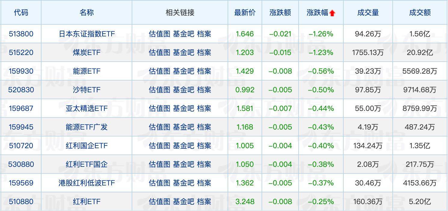 下跌方面,日本东证指数ETF、煤炭ETF跌超1%。