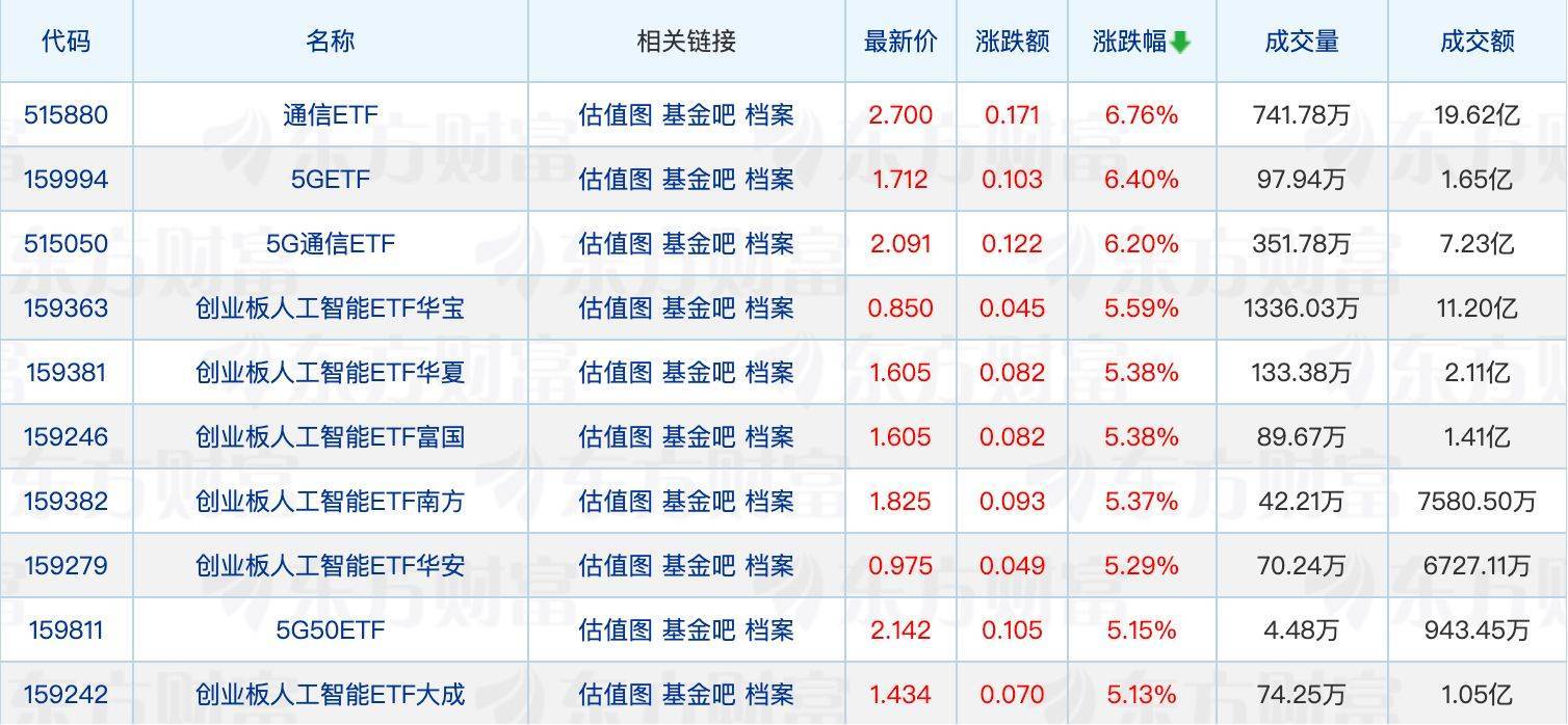 ETF涨跌幅方面,通信、5G相关ETF涨超6%。