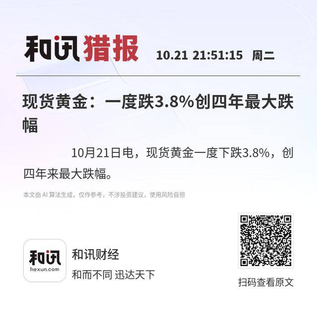 10月21日电,现货黄金一度下跌3.8%,创四年来最大跌幅。