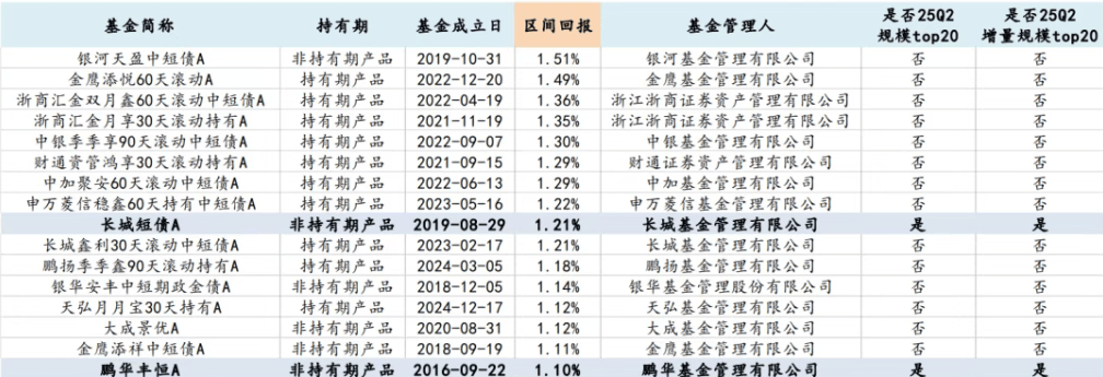 2025第二季度短债业绩排名靠前