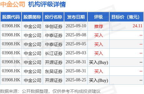 截至2025年10月23日收盘,中金公司(03908.HK)报收于21.7港元,上涨1.69%,成交量1910.61万股,成交额4.07亿港元。投行对该股的评级以买入为主,近90天内共有4家投行给出买入评级,近90天的目标均价为24.11港元。华创证券最新一份研报给予中金公司推荐评级,目标价24.11港元。