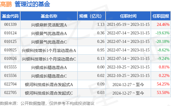 高鹏先生:中国国籍,中共党员,研究生、硕士。历任国泰君安期货研究所分析师、上海证券研究所分析师、东北证券研究所高级分析师、方正证券研究所资深分析师,2018年7月加入兴银基金管理有限责任公司研究发展部任行业研究员、基金经理助理。2021年5月19日至2023年11月15日担任兴银鼎新灵活配置混合型证券投资基金基金经理。2022年7月14日至2023年11月15日担任兴银科技增长1个月滚动持有期混合型证券投资基金基金经理。2022年10月25日至2023年11月15日担任兴银成长精选混合型证券投资基金的基金经理。2022年7月14日至2023年11月15日担任兴银景气优选混合型证券投资基金基金经理。2023年12月加入银河基金管理有限公司,现担任股票投资部基金经理。