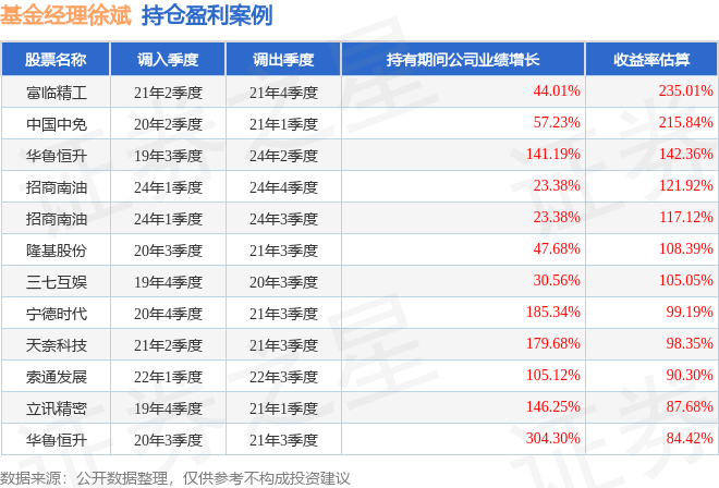 徐斌管理的富国精诚回报12个月持有期混合A基金在21年2季度买入富临精工,在持有2个季度后在21年4季度卖出。持有期间的估算收益率为235.01%,持有期间富临精工在2020年到2021年的年报营业总收入增幅达44.01%。
