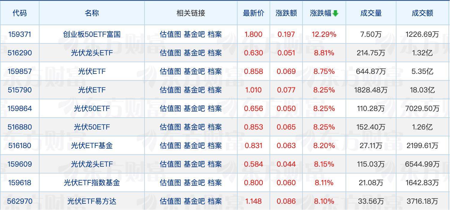 具体来看,创业板50ETF富国领涨12.29%。光伏板块爆发,隆基绿能、通威股份等多股涨停,光伏相关ETF集体走强,多只产品涨幅超过8%。