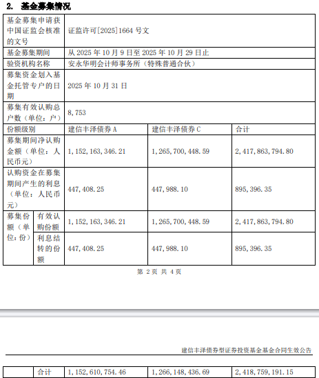 募集期间净认购金额2,417,863,794.80元,认购资金在募集期间产生的利息895,396.35元,募集份额合计2,418,759,191.15份。