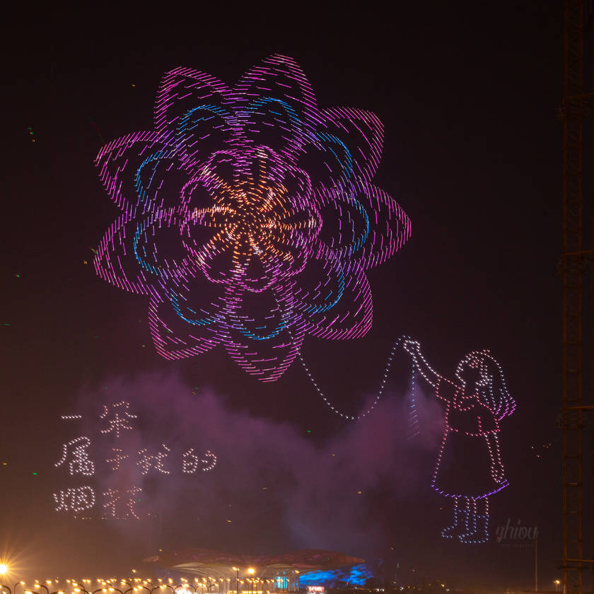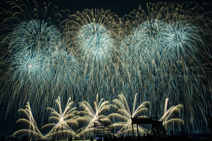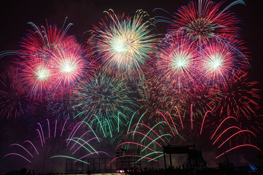 在等待烟花开始前,我早早的调好了参数并且将焦距推至105mm,对准夜空中正处于绽放顶点的烟花,R6 Mark II即使在晚上的对焦也能瞬间抓住焦点。曝光时间设为5s,ISO控制在100,画面中烟花的每一丝火花都锐利分明。
