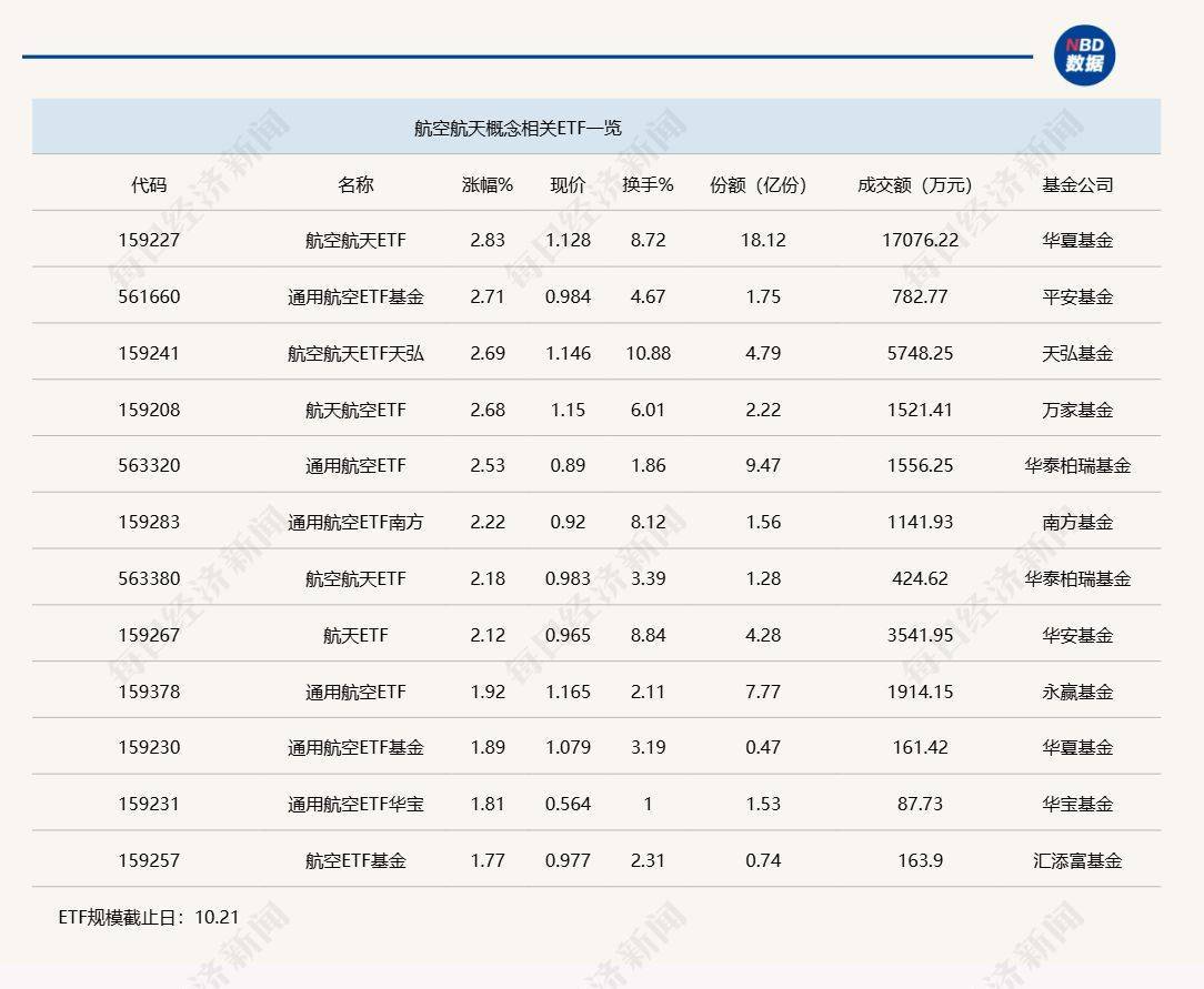 点评:通用航空ETF基金(561660)半日涨幅也达到2.71%,其份额为1.75亿份,半日成交金额为783万元。该ETF追踪的是中证通用航空主题指数。