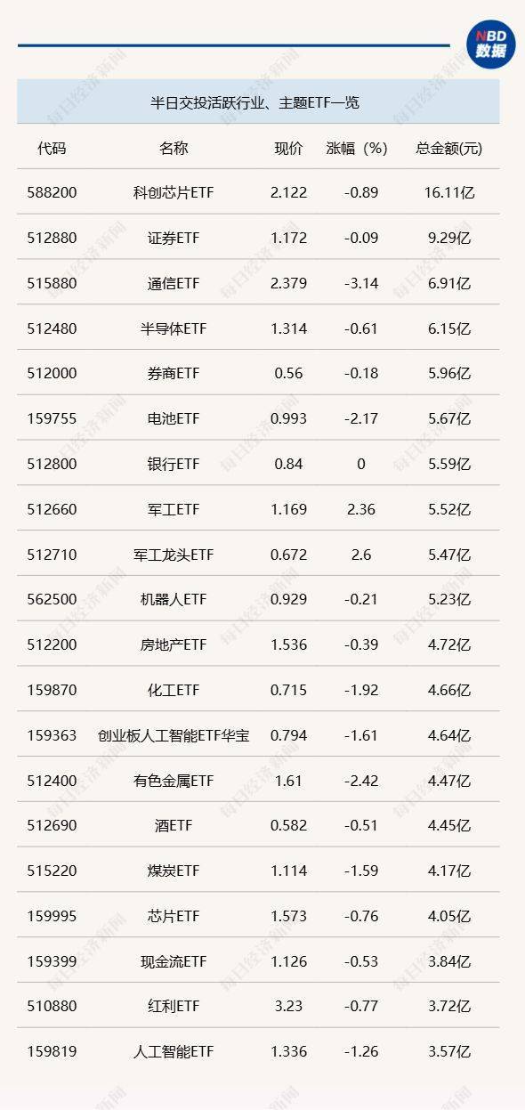 11月24日早盘,ETF交易全线缩量,行业、主题相关ETF仅科创芯片ETF(588200)半日成交金额超过10亿元;跨境ETF方面,两只恒生科技ETF半日成交金额超过40亿元,而香港证券和港股创新药ETF同样缩量明显,半日成交金额均未超过40亿元。