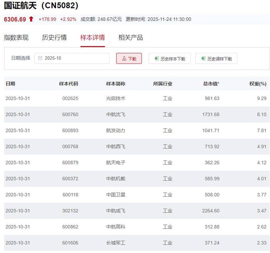 国证航天指数(代码 CN5082)由沪深北交易所国证三级行业为航天航空的证券组成,旨在精准反映该行业证券的整体走势。其选样方法严谨,从符合条件的股票中选取自由流通市值靠前的 50 只股票作为成分股,且样本每半年调整一次,确保指数能够及时跟上行业发展变化。指数采用自由流通市值加权,单个样本权重上限为 15%,这种编制方式既保证了大市值核心企业对指数的影响力,又给予中小市值成长型企业一定的权重空间,使指数更具代表性与灵活性。