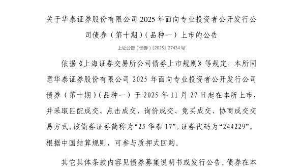 依据《上海证券交易所公司债券上市规则》等规定,上交所同意华泰证券股份有限公司2025年面向专业投资者公开发行公司债券(第十期)(品种一)于2025年11月27日起在上交所上市,并采取匹配成交、点击成交、询价成交、竞买成交、协商成交交易方式。该债券证券简称为“25华泰17”,证券代码为“244229”。根据中国结算规则,可参与质押式回购。