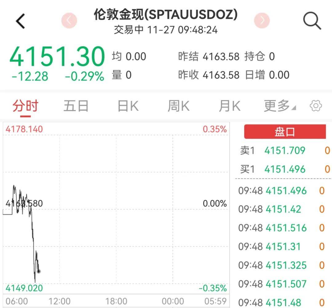 北京时间11月27日,现货黄金短线下挫,回落至4150美元/盎司下方。