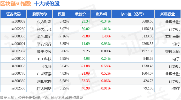 证券之星消息,11月26日,区块链50(399286)指数报收于3956.35点,跌0.58%,成交453.52亿元,换手率2.26%。当日该指数成份股中,上涨的有9家,美的集团以1.4%的涨幅领涨,下跌的有38家,视觉中国以3.95%的跌幅领跌。