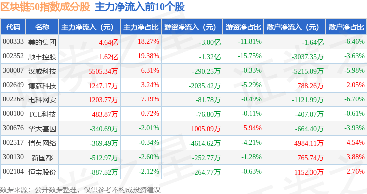 资金流向方面,区块链50(399286)指数成份股当日主力资金净流出合计25.14亿元,游资资金净流出合计2.24亿元,散户资金净流入合计27.38亿元。成份股资金流向详情见下表: