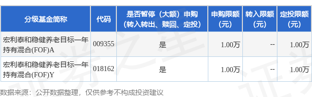 证券之星消息,11月28日宏利基金管理有限公司发布《宏利泰和稳健养老目标一年持有期混合型基金中基金(FOF)基金暂停大额申购、定期定额投资公告》。公告中提示,为保证本基金的稳定运作,保护基金份额持有人利益,自2025年11月28日起宏利泰和稳健养老目标一年持有期混合型基金中基金(FOF)基金暂停大额申购、定期定额投资,申购上限金额为1.0万元,下属分级基金调整明细如下: