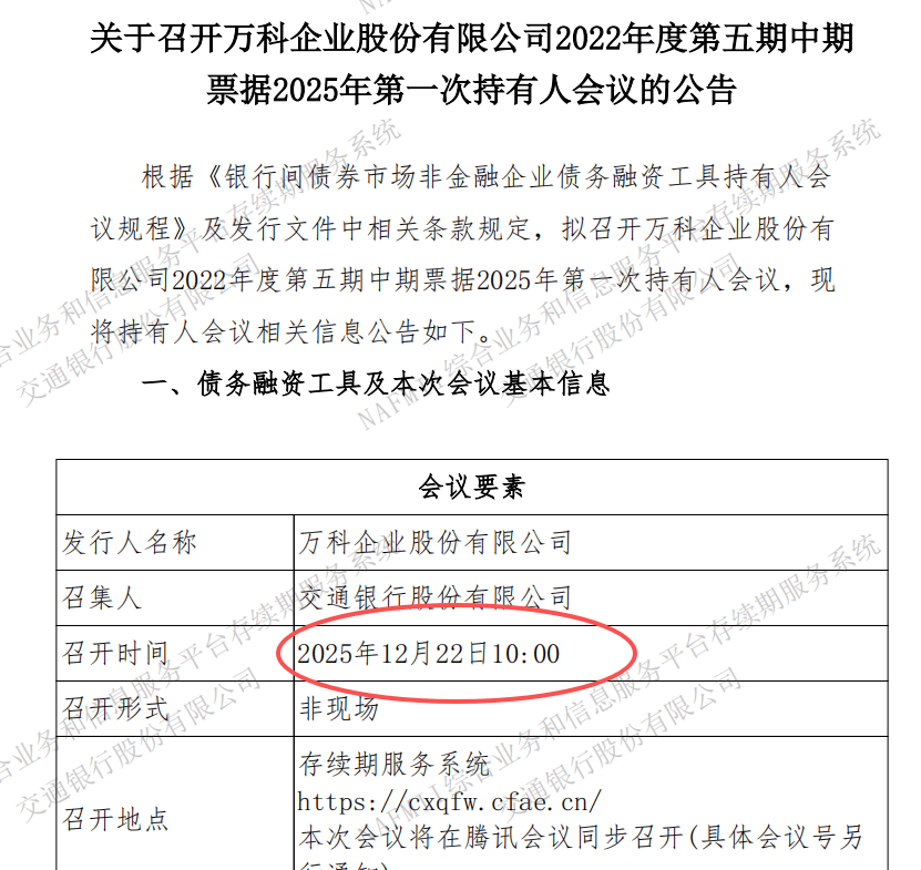 上海清算所12月5日晚间公告显示,万科将召开"22万科MTN005"持有人会议,商议该债券展期事宜。该债券余额37亿元,本计息期利率3%,原定于2025年12月28日到期。会议召集人为交通银行,将于12月22日召开。