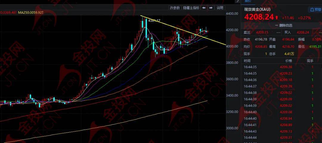 上周五,现货黄金呈现出典型的冲高回落走势,一度飙升至4260美元关口附近,但随后快速转跌,尾盘收报4196.03美元,回落至4200美元关口下方。今日欧市盘中,黄金小幅上涨,目前在4206美元附近徘徊。