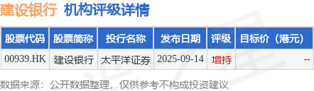 截至2025年12月9日收盘,建设银行(00939.HK)报收于7.61港元,下跌0.65%,成交量2.65亿股,成交额20.31亿港元。投行对该股的评级以增持为主,近90天内共有1家投行给出增持评级。太平洋证券最新一份研报给予建设银行增持评级。