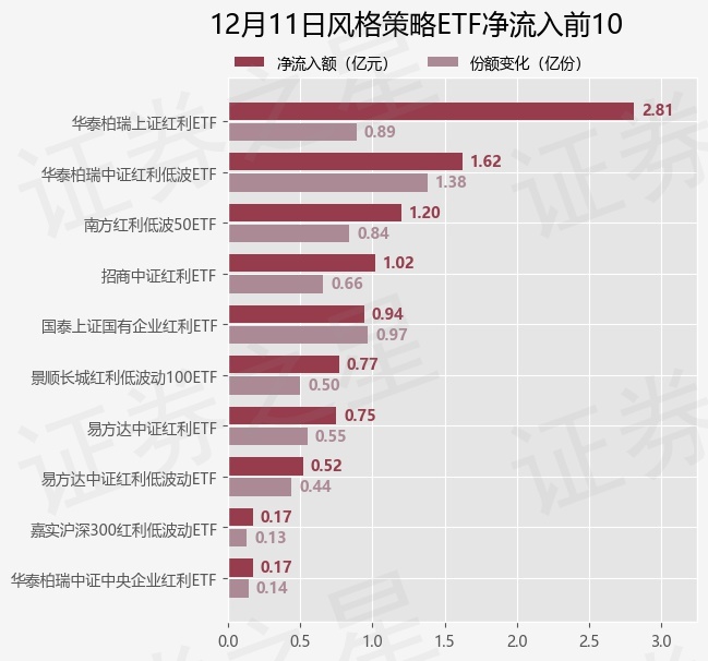 当日有14只风格策略ETF基金出现资金净流入,其中净流入排首位的是华泰柏瑞上证红利ETF(510880),份额增加了8900.0万份,净流入额为2.81亿元。