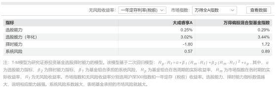 通过对大成睿享A的业绩进行深度分析,基金的择时能力严重跑输同类平均水平,为-1.80,远低于平均的1.72。选股能力也并不突出,为0.25%,低于同类平均水平的0.29%。与大成高鑫A的特点类似,系统风险也较低,为0.57,低于同类水平的0.89。