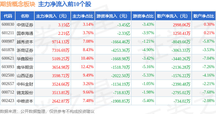 从资金流向上来看,当日期货概念板块主力资金净流入7.42亿元,游资资金净流出7.2亿元,散户资金净流出2124.92万元。期货概念板块个股资金流向见下表: