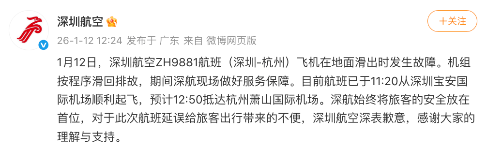 ● 1月12日,深圳飞杭州一航班在地面滑出时发生故障,深航致歉:机组按程序滑回排故,航班已顺利起飞。