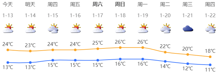 深圳今日晴天间多云,空气干燥;气温13-24℃;东北风2-3级;相对湿度35%-75%。