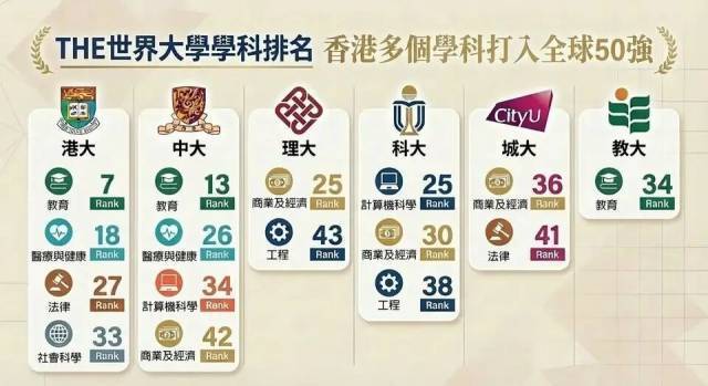 香港高等院校在2026年泰晤士高等教育世界大学学科排名中展现卓越实力,继续在教育学及医学与健康范畴保持顶尖表现,香港大学的教育学科稳居全球前10,排名第7。