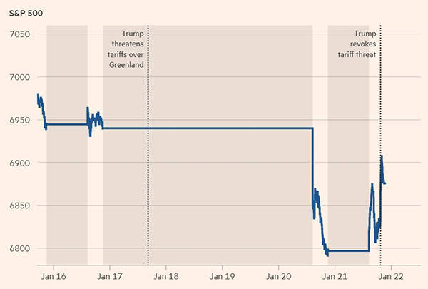 特朗普就格陵兰问题发出关税威胁后,标普500指数变化《金融时报》制图
