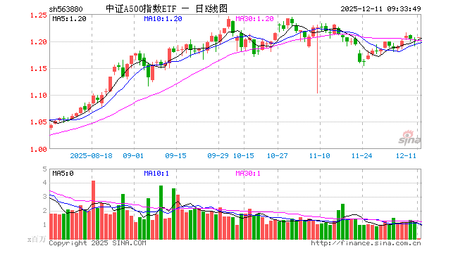 12月11日,中证A500指数ETF(563880)开盘涨0.25%,报1.206元。中证A500指数ETF(563880)重仓股方面,宁德时代开盘涨0.66%,贵州茅台涨0.28%,中国平安涨0.40%,招商银行涨0.38%,紫金矿业涨1.46%,新易盛跌0.86%,中际旭创跌0.97%,美的集团涨0.06%,东方财富涨0.26%,长江电力涨0.11%。