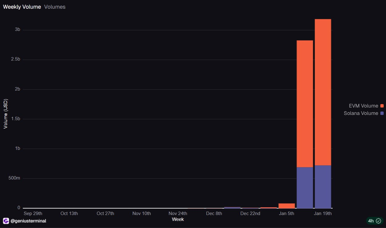 吴说获悉,据官方面板,尽管本周才进行不到一半,由 CZ 作顾问的交易终端 Genius Terminal 周交易量已超过 30 亿美元,超过了上周创下新高,其中在 1 月 20 日单日交易量超过 17 亿美元,创下新的单日记录,这可能是因为代币空投日期确定随之带来了大量的为博取空投的刷量行为。