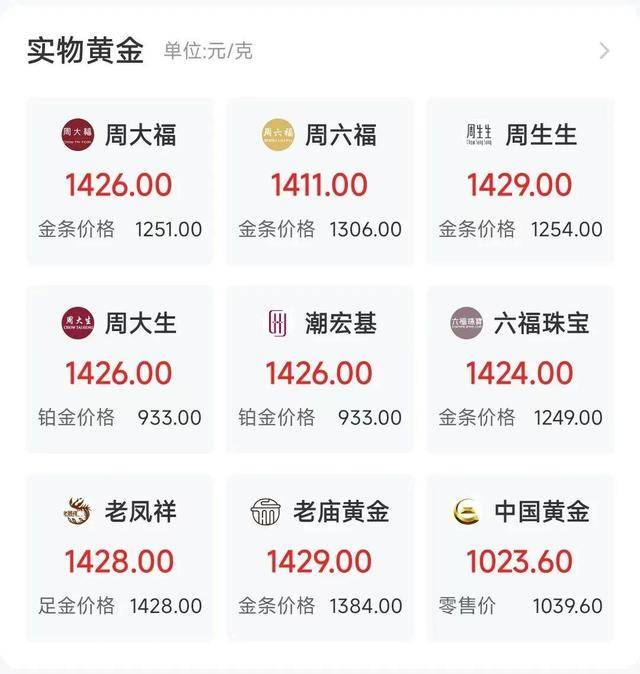 受国际金价带动,国内黄金饰品价格也普遍上涨,多个品牌足金报价突破1400元/克。其中,周生生、老庙报价1429元/克,周大福、周大生报价1426元/克,六福珠宝报价1424元/克,较昨日普遍上涨了20元/克。