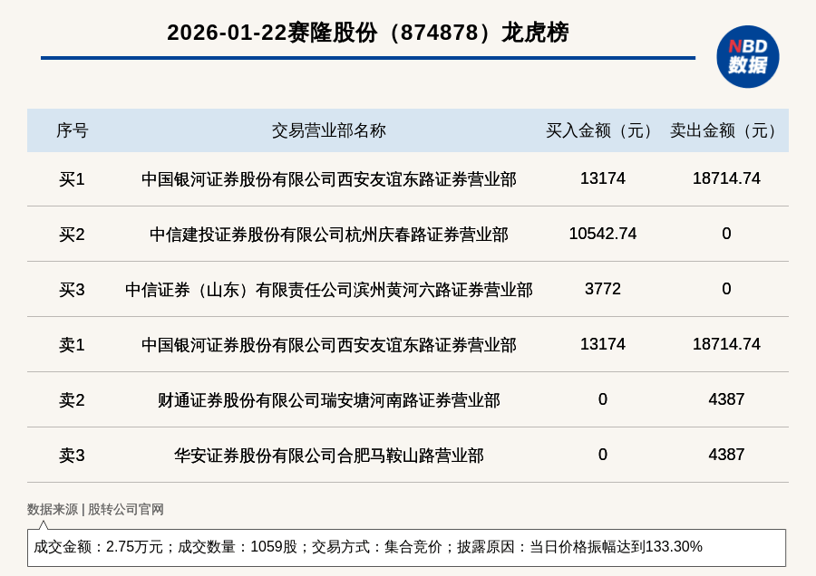 每经讯,2026年1月22日,新三板基础层公司赛隆股份(874878,收盘价:18.86元)登上龙虎榜,交易方式是集合竞价,披露原因是当日价格振幅达到133.30%,成交数量1059股,成交金额2.75万元。买一席位为中国银河证券股份有限公司西安友谊东路证券营业部,买入1.32万元;卖一席位为中国银河证券股份有限公司西安友谊东路证券营业部,卖出1.87万元。