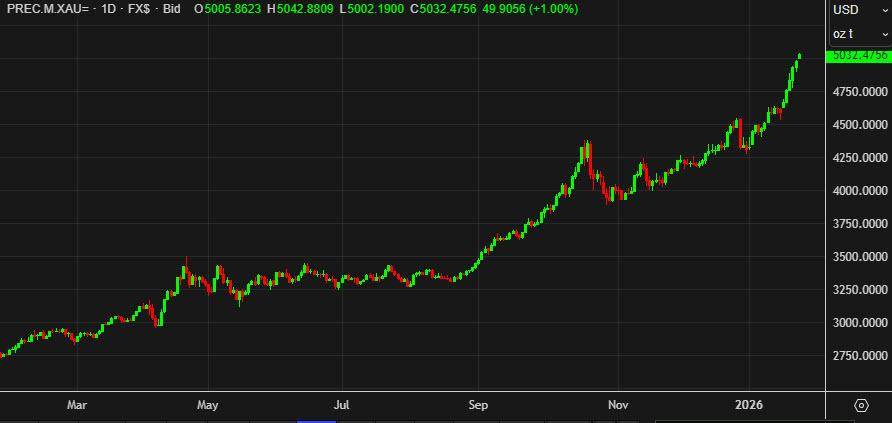 周一(1月26日)标普500指数期货下跌0.35%,美元对主要货币普遍走弱。对“黄金多头”来说,这却是一个标志性时刻:黄金价格首次触及司5000美元。自去年8月以来,这轮涨势极其强劲,今年迄今已上涨17%。