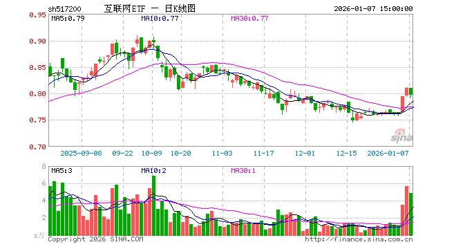 1月7日,互联网ETF(517200)跌1.60%,成交额393.37万元。当日份额增加100.00万份,最新份额为1.23亿份,近20个交易日份额增加100.00万份。最新资产净值计算值为9799.23万元。