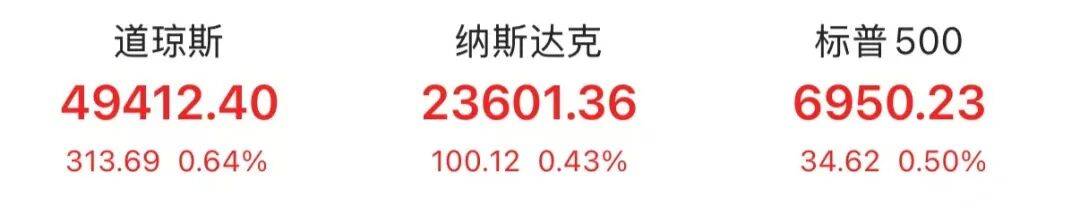 美东时间周一,美股高开高收,三大指数集体上涨。截至收盘,道琼斯指数涨0.64%,报49412.40点;标普500指数涨0.5%,报6950.23点;纳斯达克综合指数涨0.43%,报23601.36点。