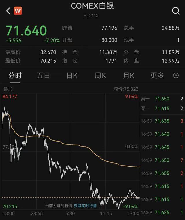 作为日内全球市场的焦点,这一轮金属上涨狂潮的“带头大哥”白银日内巨震,Comex白银期货创出每盎司82美元新高后跳水至71.6美元