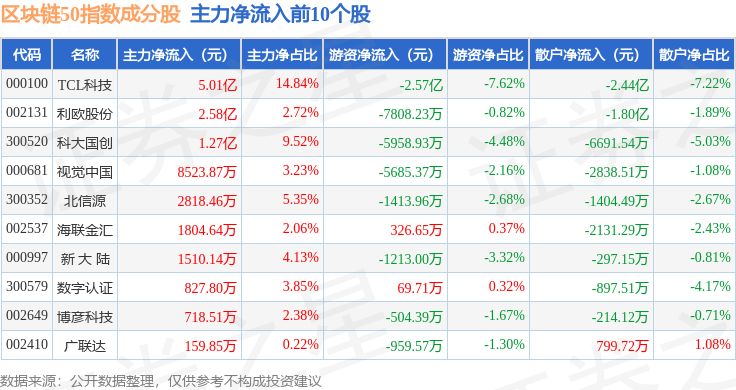资金流向方面,区块链50(399286)指数成份股当日主力资金净流出合计27.0亿元,游资资金净流出合计1536.3万元,散户资金净流入合计27.15亿元。成份股资金流向详情见下表: